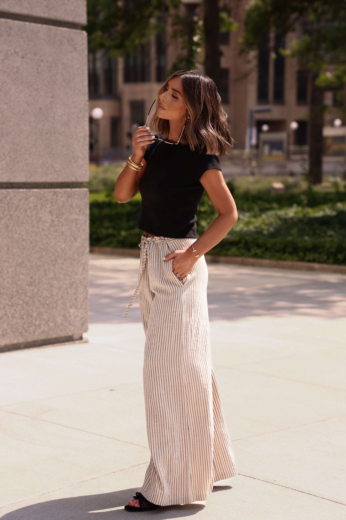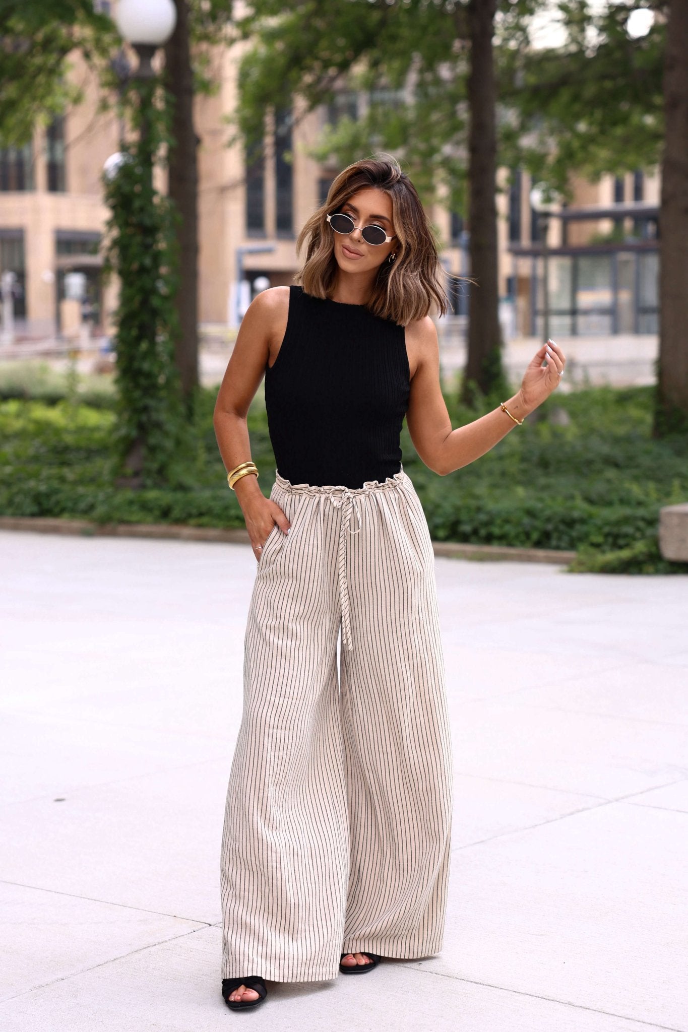 Easy polish with a relaxed feel—the Blair Pinstripe Pants are made for office days and beyond. Designed with a high-rise waist, wide-leg silhouette, and an adjustable drawstring for all-day comfort. The elastic waistband features a subtle ruffle detail, while side seam pockets add functionality. Finished in a soft oatmeal pinstripe, these trousers pair perfectly with everything from structured blouses to simple tanks.