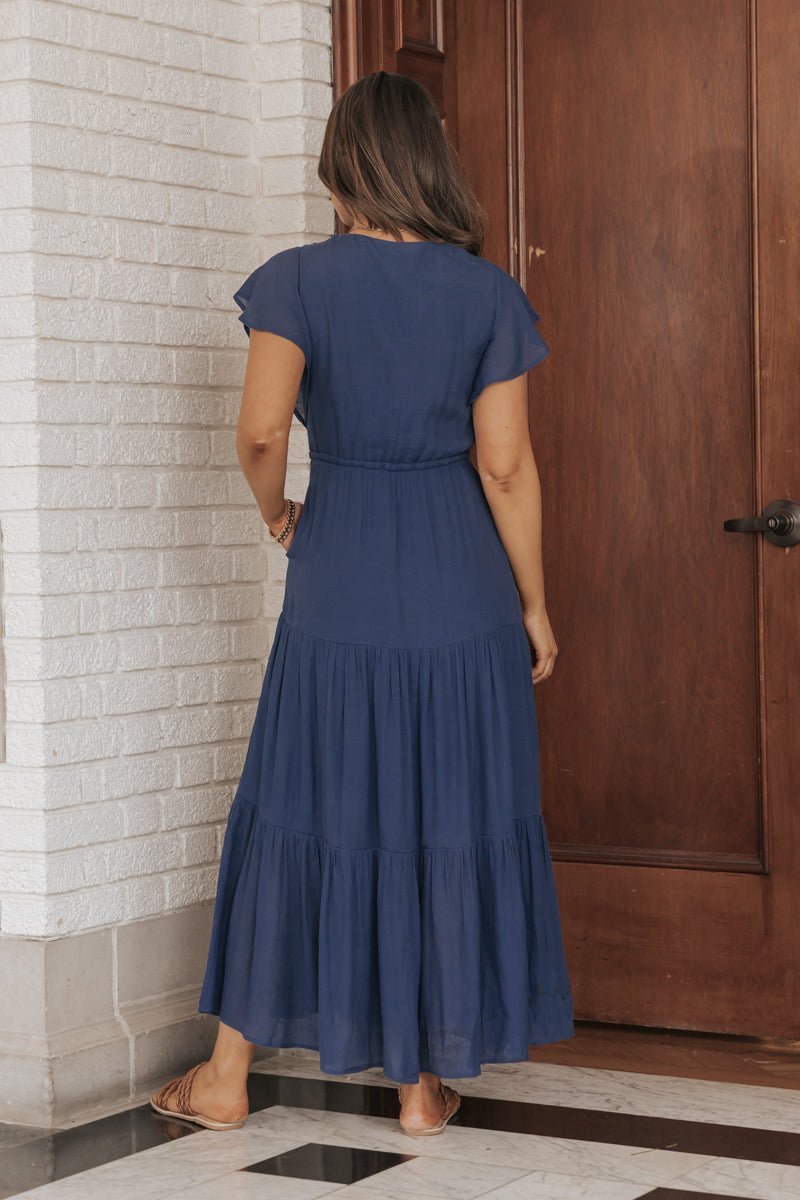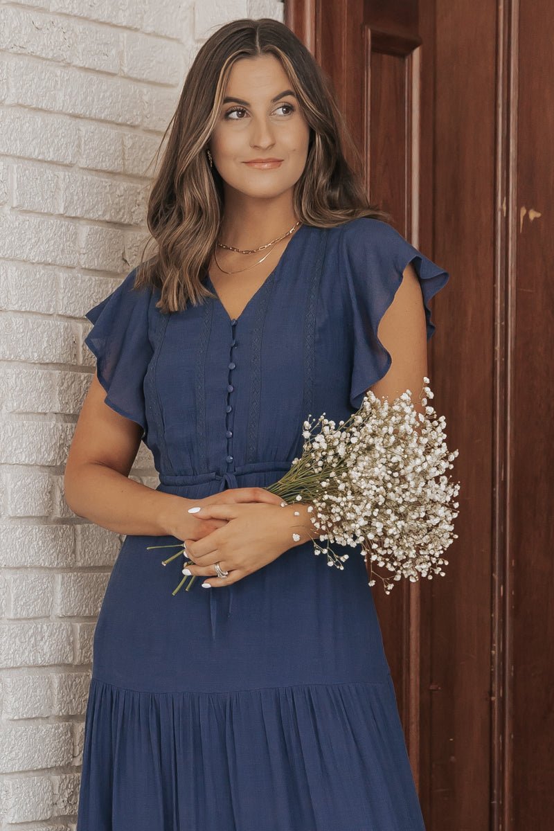 Our Celine Crochet Lace Tiered Boho Midi Dress is now available in Navy! Features short ruffle sleeves, a v neckline with functional front buttons, a stretchy elastic waist with a self-tie, and a tiered maxi length. Style with slide sandals, a wide brim hat, and elevated gold jewelry to complete the look.