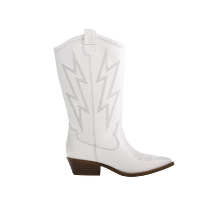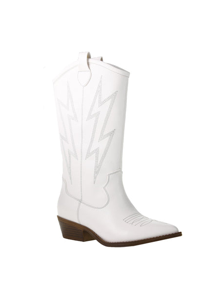 Featuring striking lightning bolt whipstitch details and a classic pointed toe, these boots bring a modern twist to timeless Western style. Designed with a low block heel for all-day wear, they include easy pull-on functionality and side pull tabs for effortless dressing. Crafted from durable manmade materials, they offer both style and practicality. With a 2" heel, 10" shaft height, and 14" calf circumference, these boots are perfect for adding a pop of personality to your favorite denim or dresses!