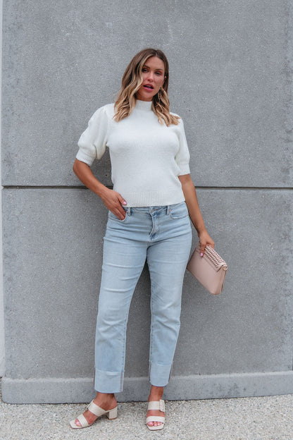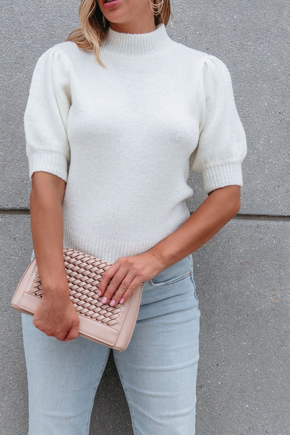 The Delaney Sweater brings elevated ease to your fall wardrobe. Made from a soft, cozy knit with ribbed texture, it features chic short puff sleeves and a timeless mock neckline. Its gently structured silhouette makes it ideal for layering or wearing solo. Pair it with trousers, denim, or midi skirts for a polished, feminine look that transitions seamlessly from desk to dinner.
