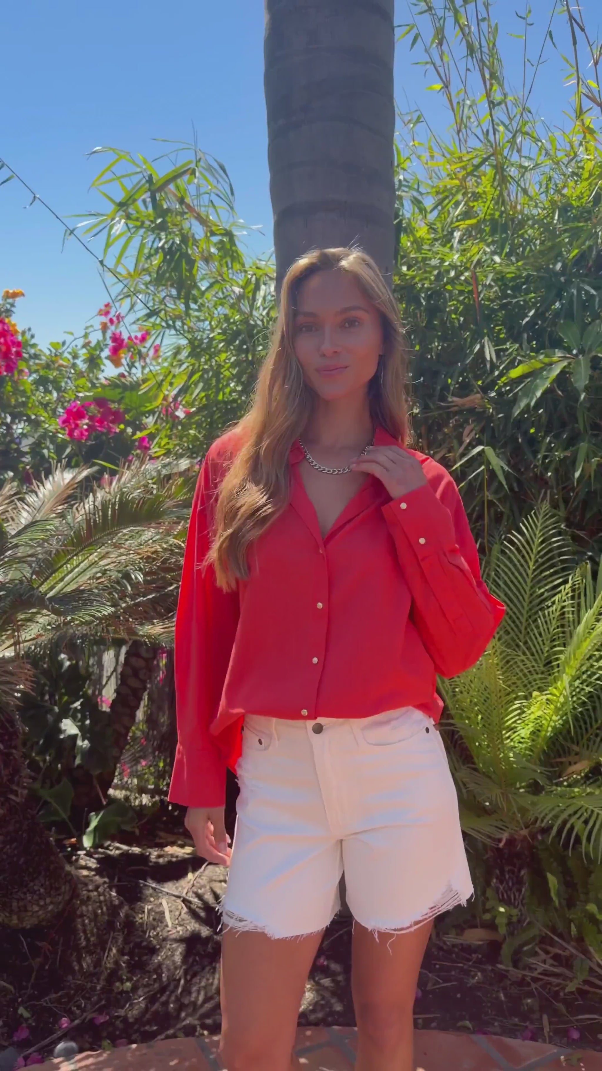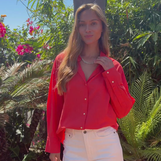 The Elan Red Button Down Collared Shirt features a polished collared V neckline with luxe gold button detailing along the front and cuffs. Designed with a relaxed fit, it delivers an effortlessly relaxed silhouette that still feels refined. This statement shirt by ELAN pairs perfectly with denim, tailored trousers, or skirts for an elevated look that transitions easily from casual days to styled evenings.