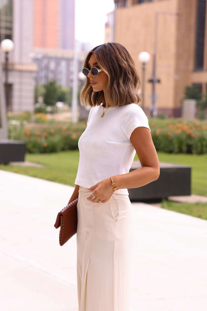 The foundation of every polished outfit—the Everyday Essential Tee is a must-have basic for your back-to-work lineup. Featuring a classic round neckline and short sleeves in soft 100% cotton, it offers a clean, comfortable fit that pairs with everything from tailored trousers to relaxed denim. Also available in black for endless versatility.