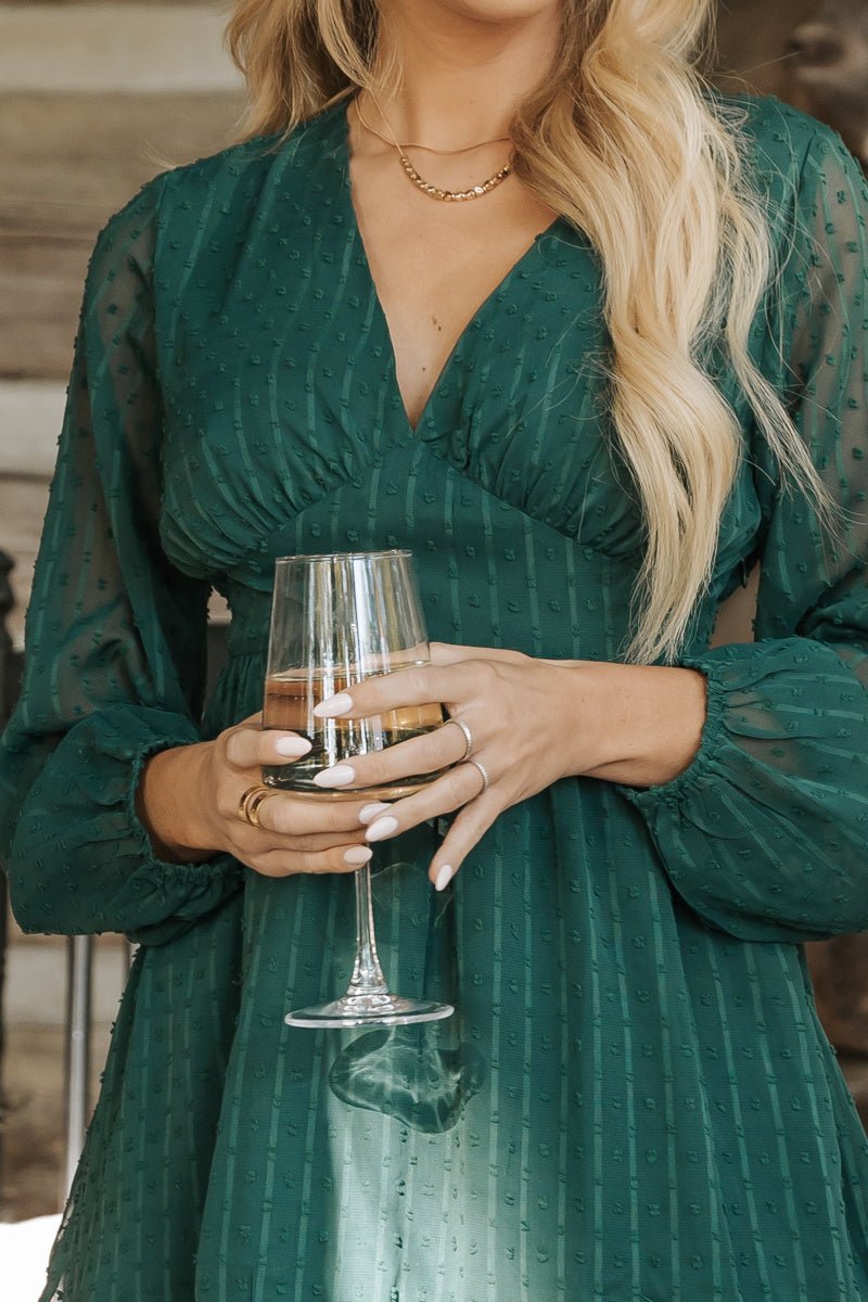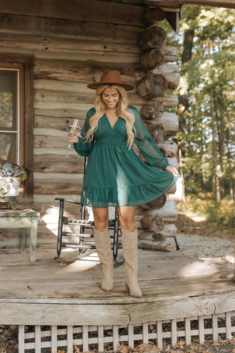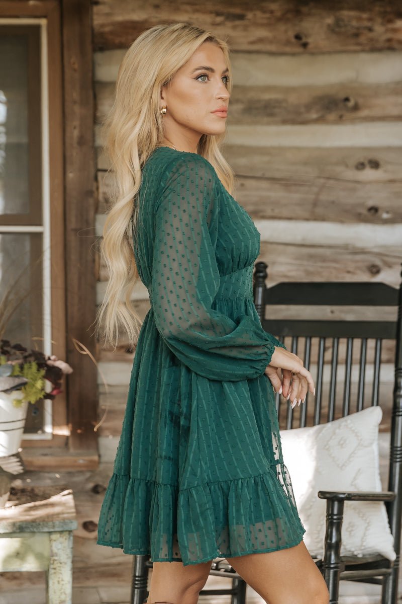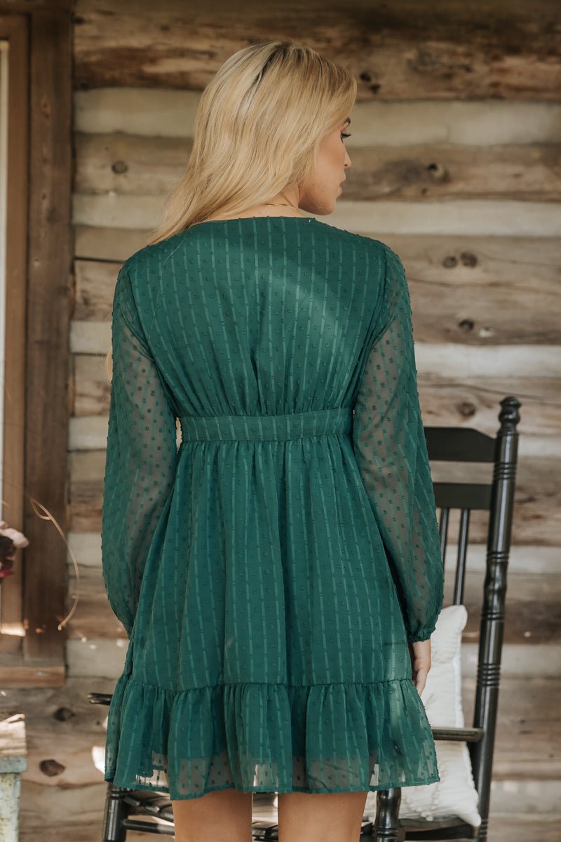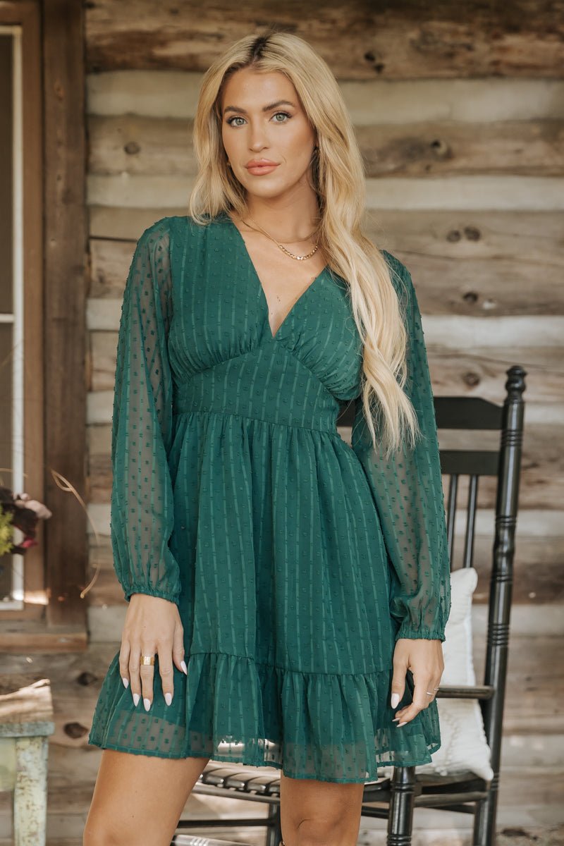 Step things up at your next event by wearing this gorgeous Green Swiss Dot Ruffled Mini Dress! Features long sleeves with elastic cuffs, a flattering v neckline, a side zipper closure, and Swiss dot fabric. Style with knee high boots, elevated gold jewelry, and a wide brim hat for a trendy fall look!