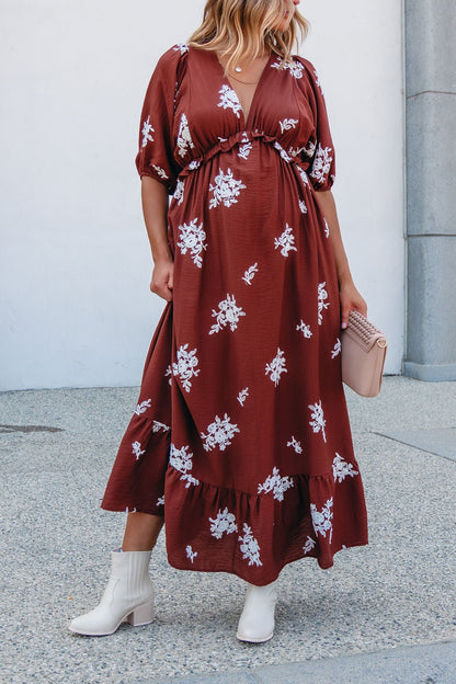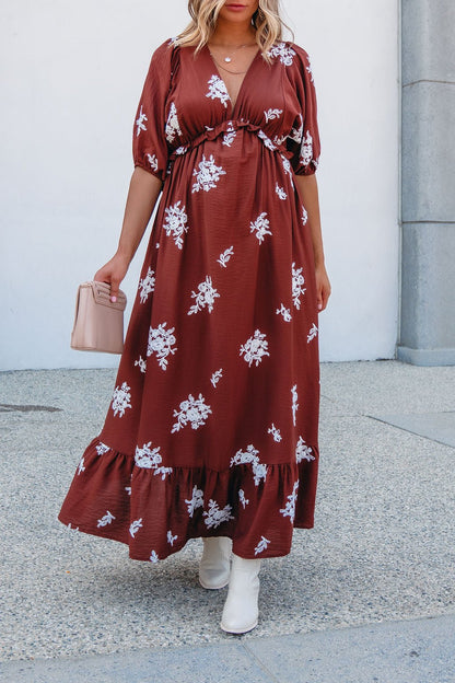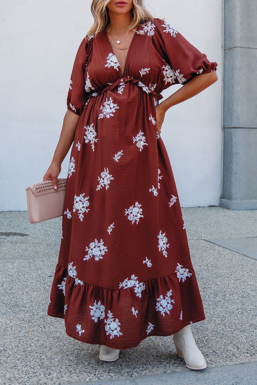 Romantic and effortlessly charming, the Maribel Maxi Dress features delicate floral embroidery and a soft brown floral print. The puff sleeves and elastic empire waist create a flattering, feminine silhouette, while the tiered skirt adds flowy movement. Perfect for weddings, brunch, or a sunset stroll.