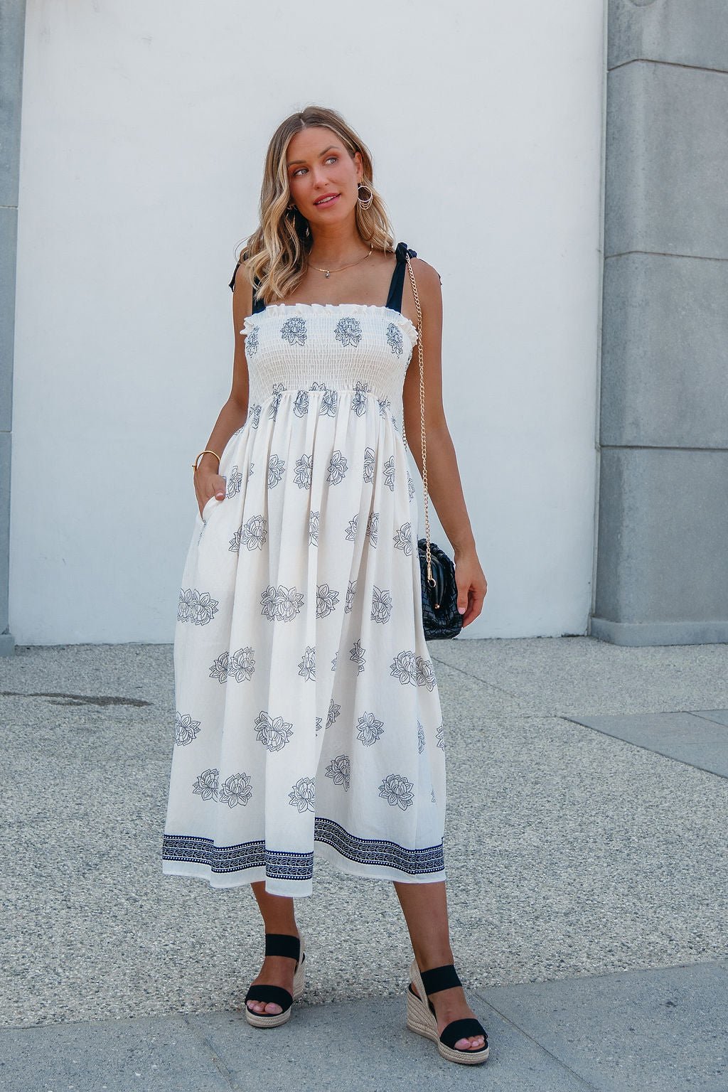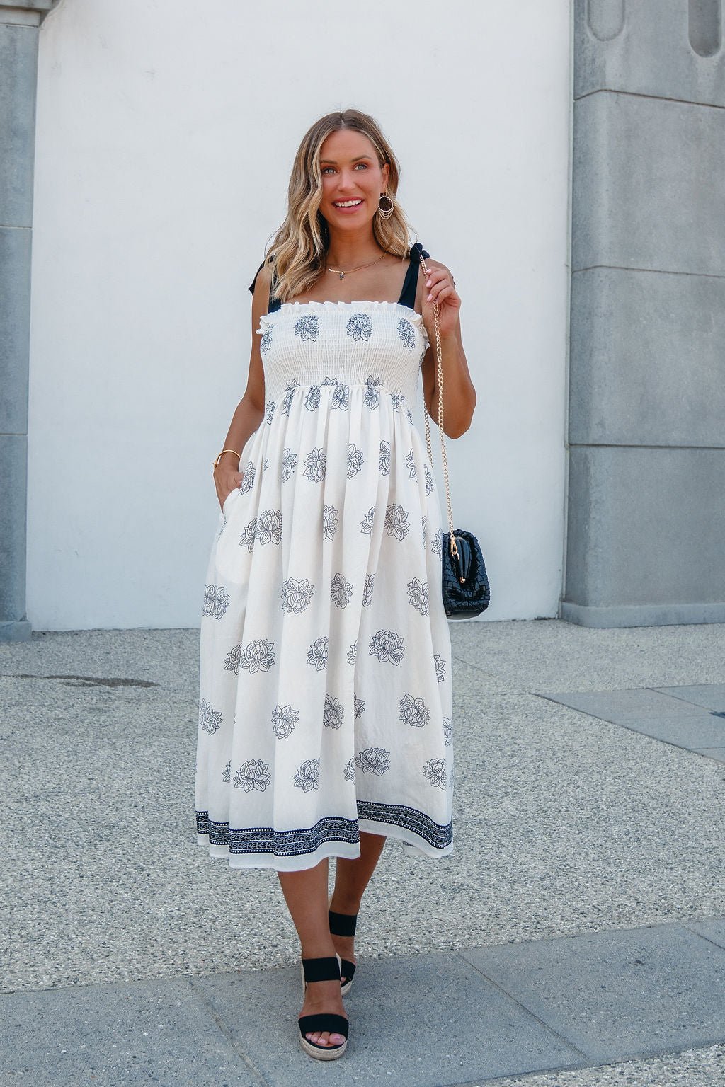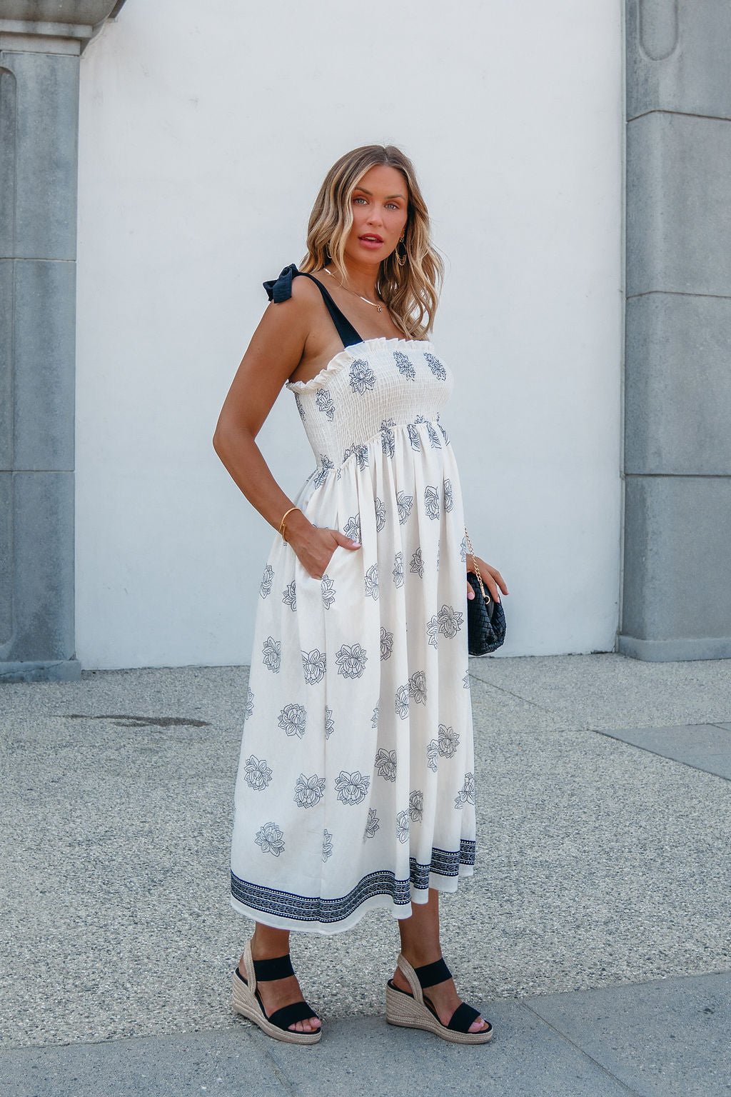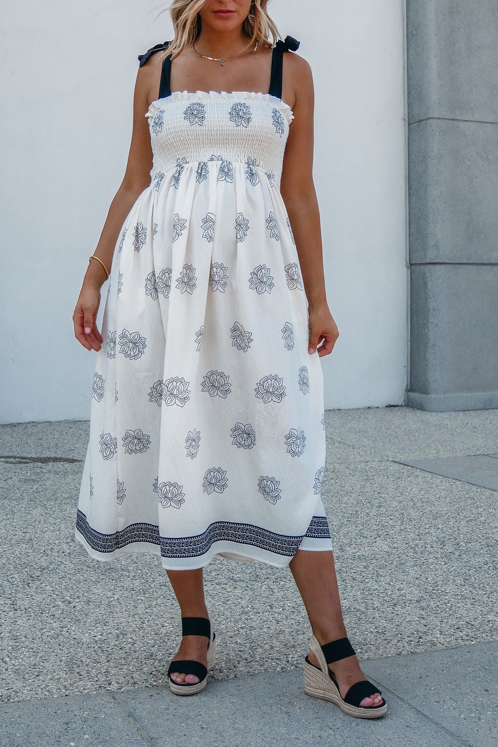 A soft silhouette with a touch of romance—The Maribel Dress brings all the charm. Designed with adjustable bow tie sleeves and an allover floral and border print, this midi features a fully smocked bodice for a flattering, bump-friendly fit. Side pockets add everyday ease, while the flowy skirt transitions beautifully into fall. Made in the USA.