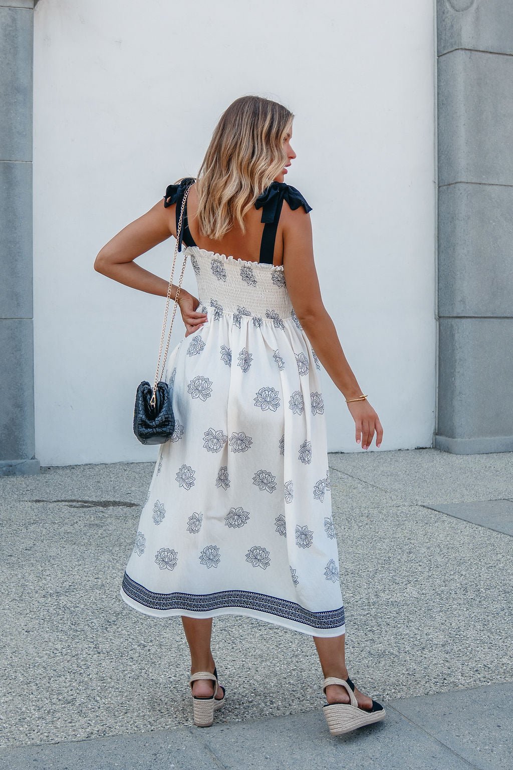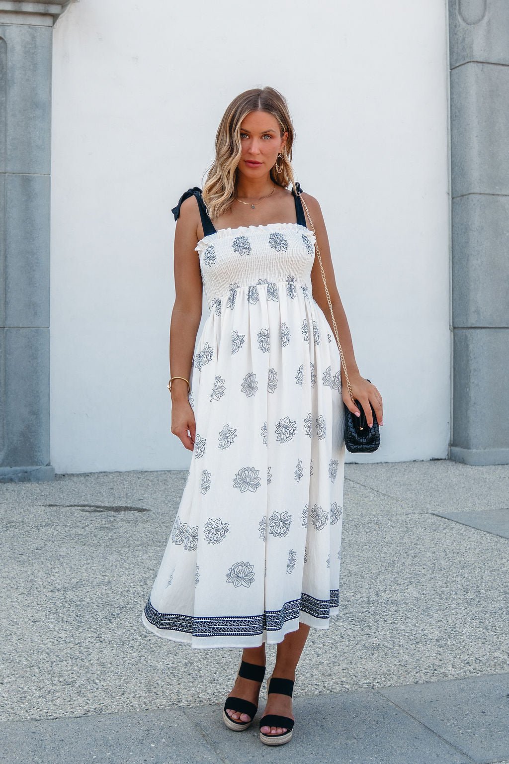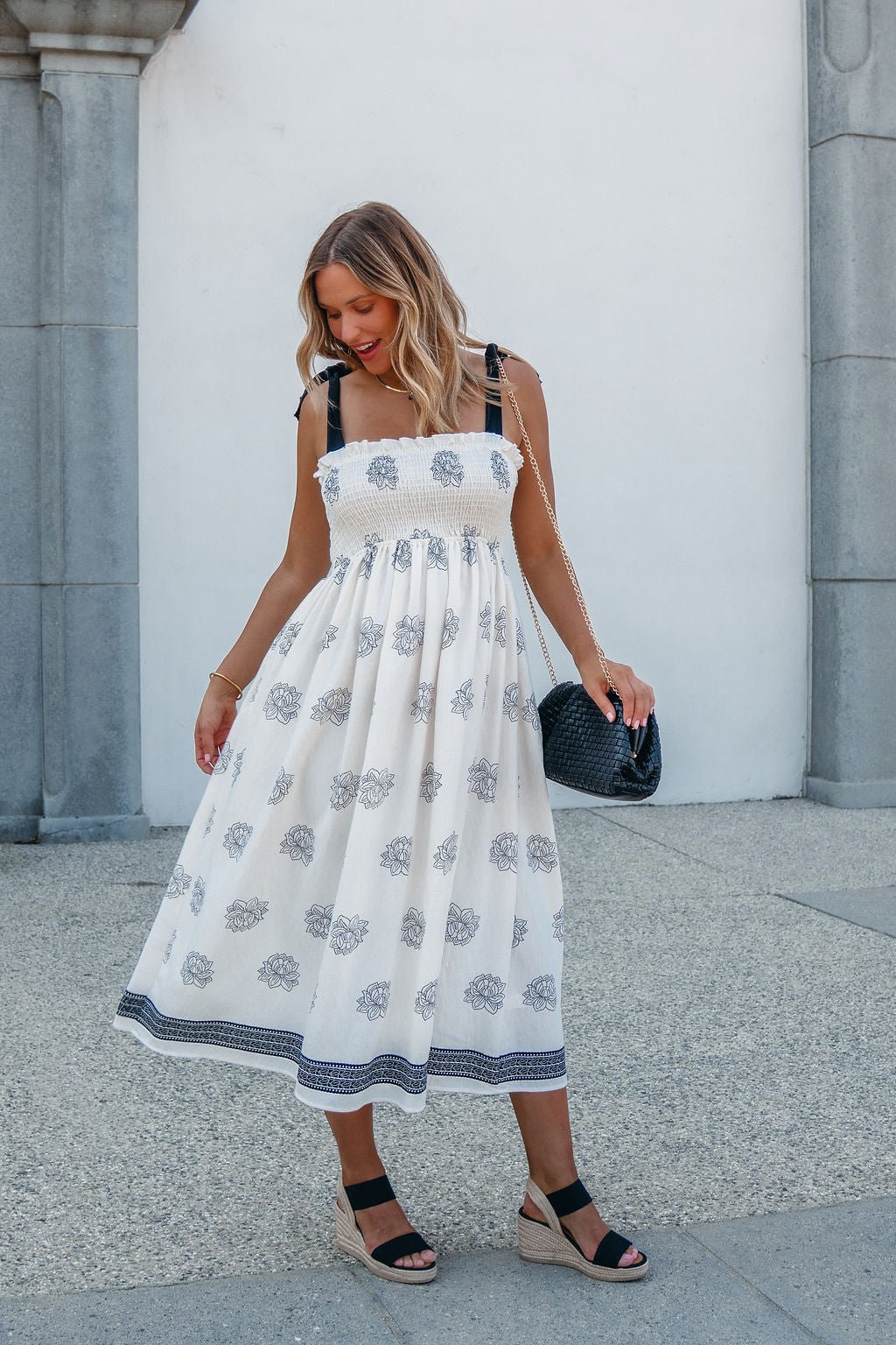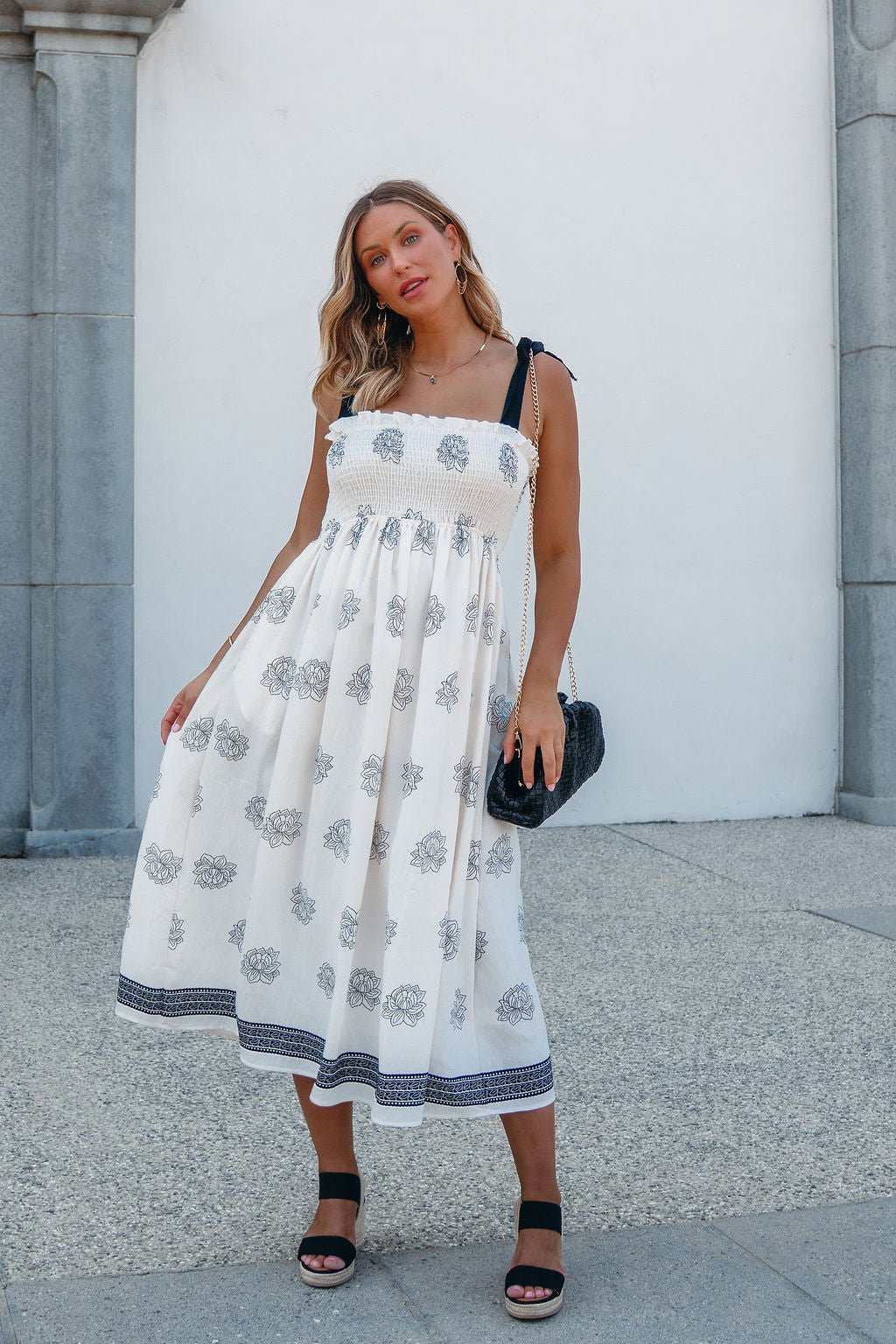 A soft silhouette with a touch of romance—The Maribel Dress brings all the charm. Designed with adjustable bow tie sleeves and an allover floral and border print, this midi features a fully smocked bodice for a flattering, bump-friendly fit. Side pockets add everyday ease, while the flowy skirt transitions beautifully into fall. Made in the USA.
