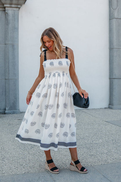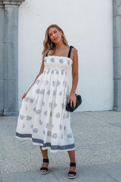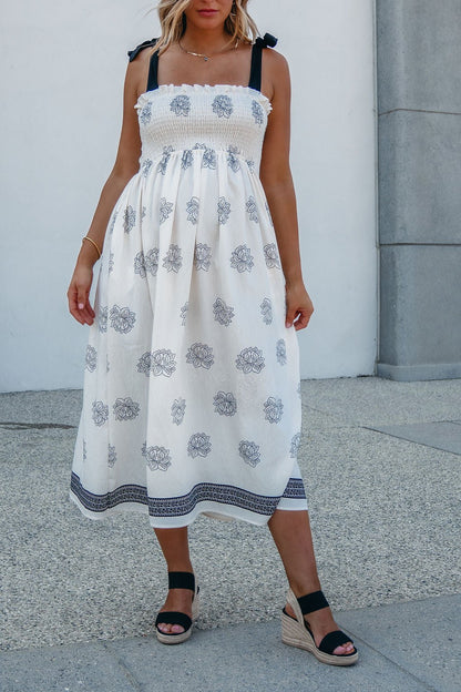 Maribel Cream Border Print Smocked Midi Dress - FINAL SALE