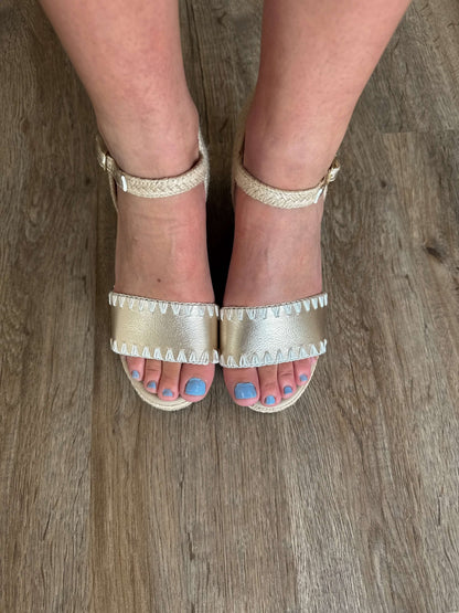 Featuring elegant stitch detailing and a striking gold double front strap, these heels add a touch of sophistication to any outfit. The 3.4" wedge heel offers steady height while keeping you comfortable all day or night. An adjustable strap ensures a secure, customized fit—ideal for everything from brunch dates to evening outings.