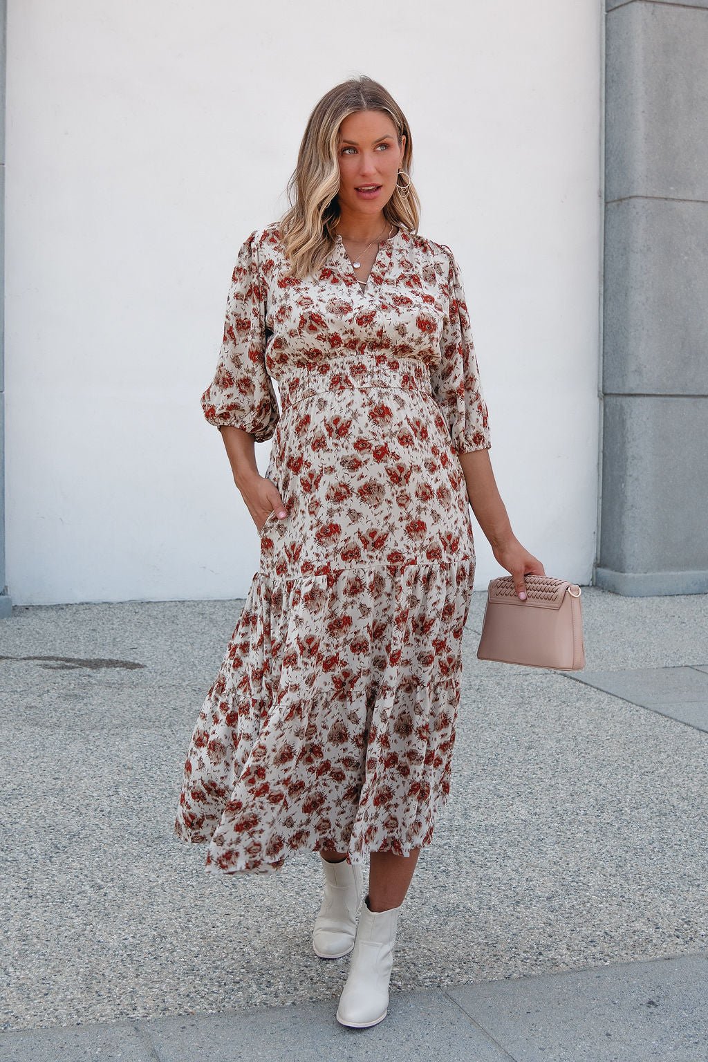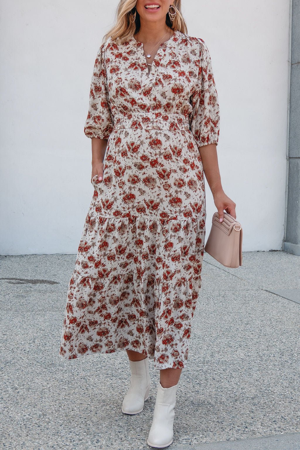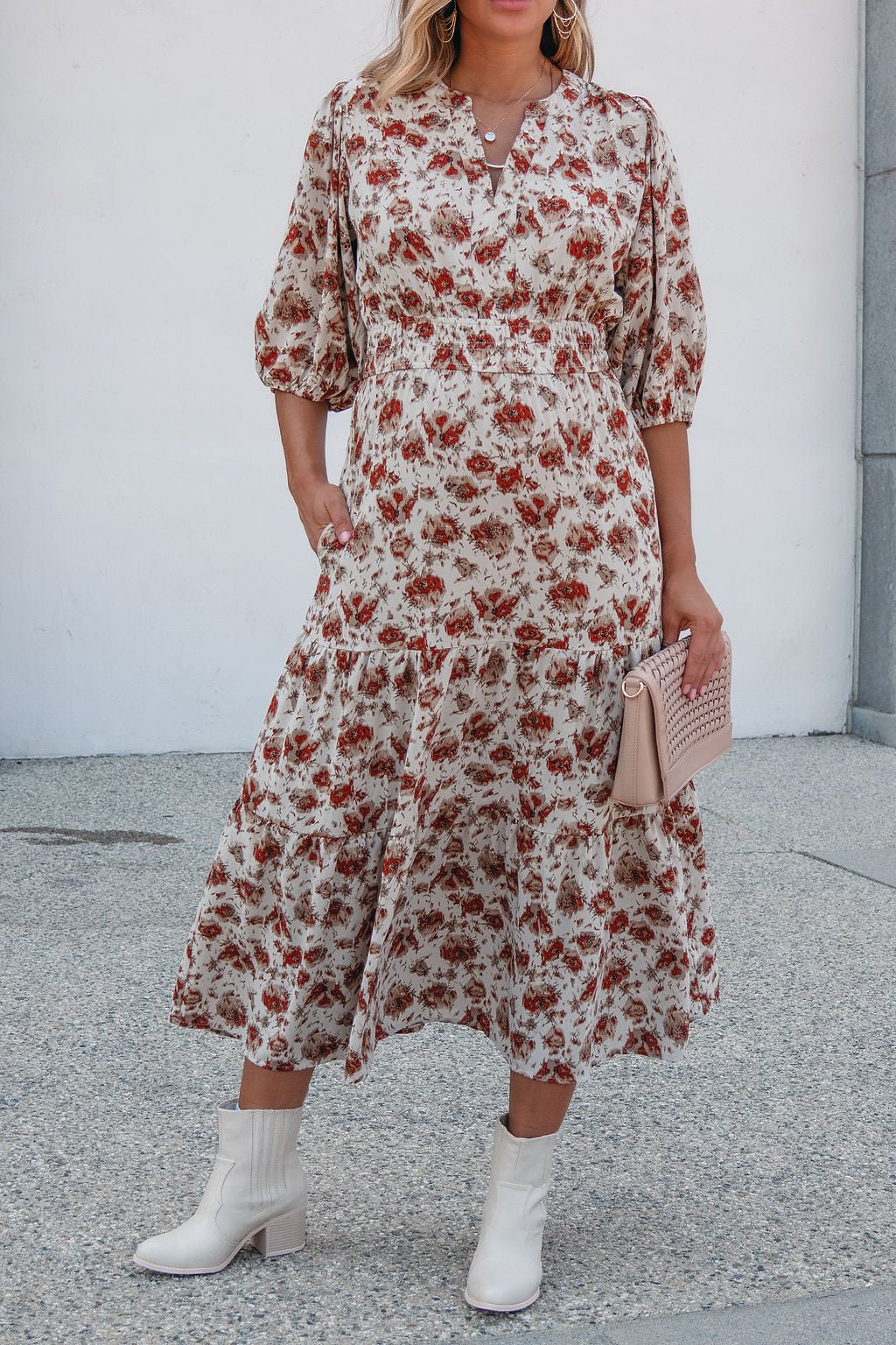 Welcome fall in the Rowan Dress — a midi moment made for crisp days and cozy nights. Featuring a warm cream and rust print, flattering elastic waist, and soft tiered silhouette, this dress brings ease and elegance to any occasion. Finished with 3/4 puff sleeves and practical side pockets, it's the perfect piece for brunch dates, fall festivities, or workday polish.