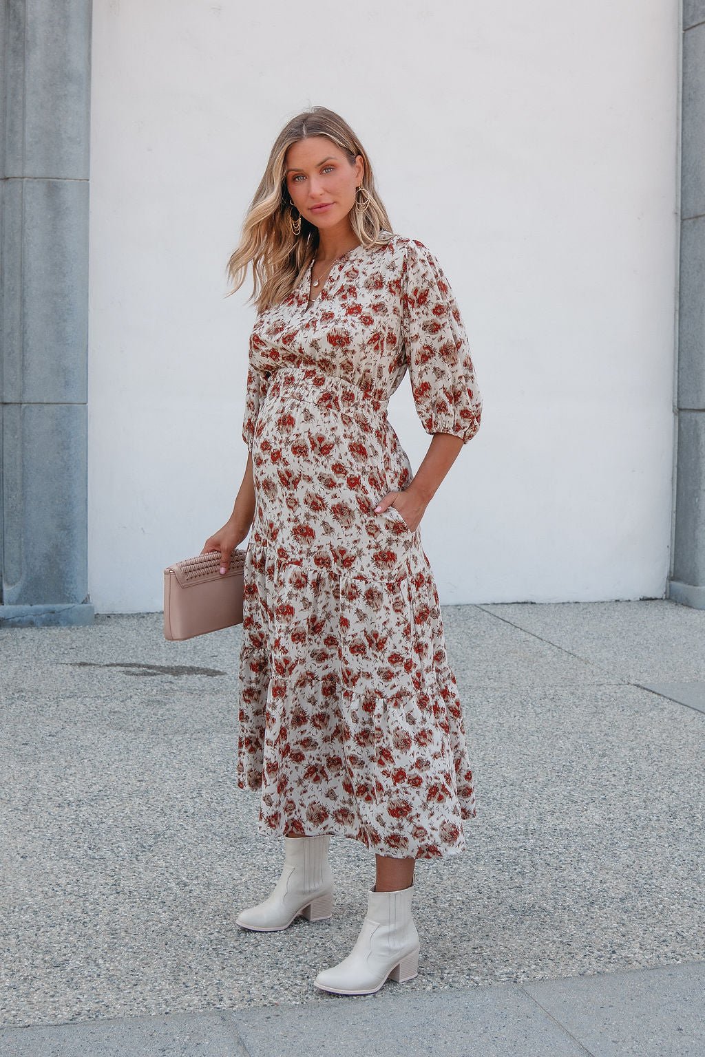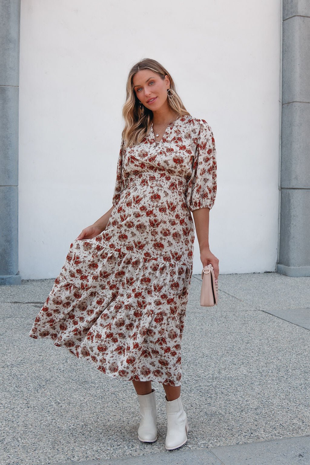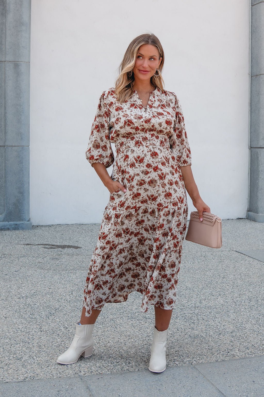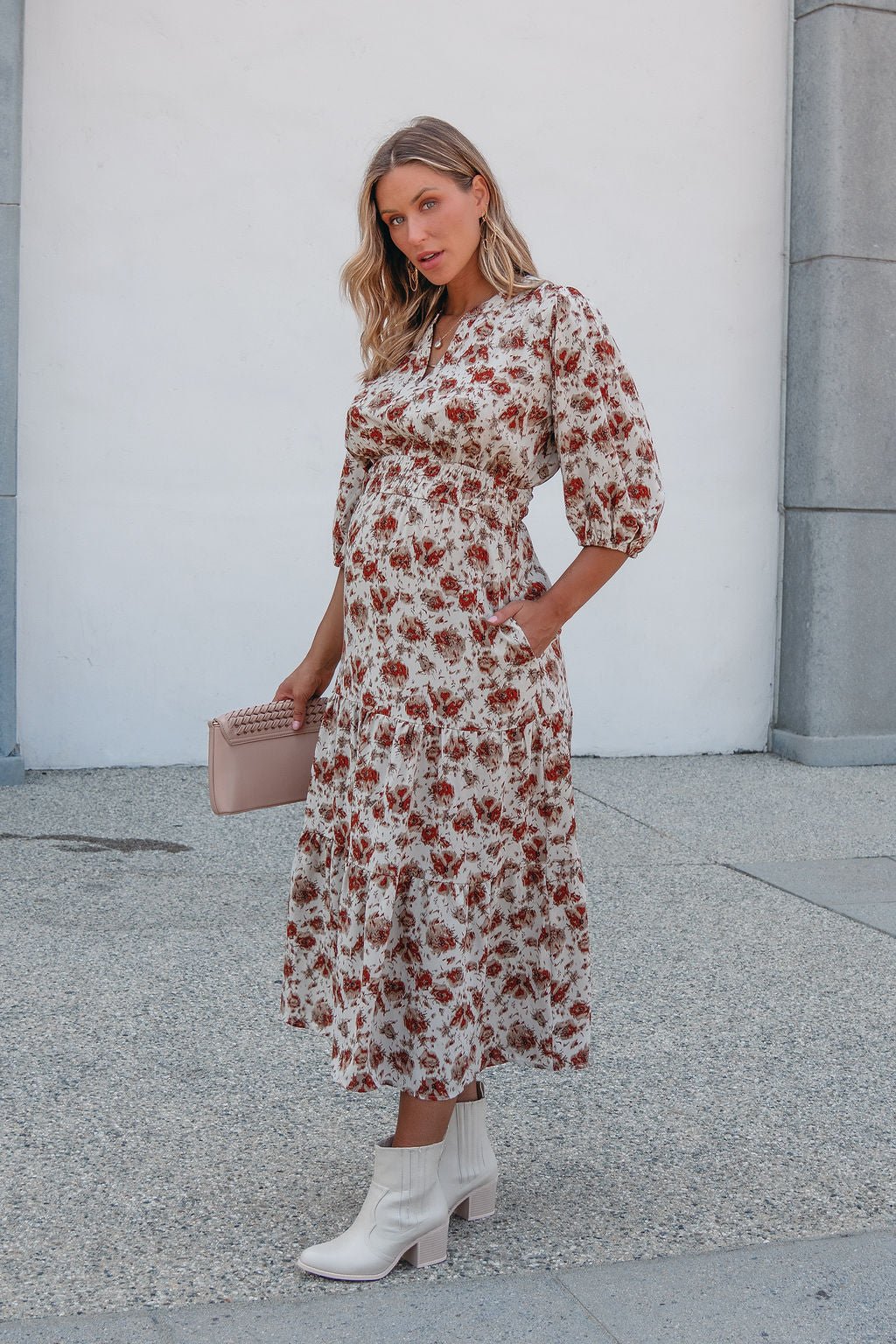 Welcome fall in the Rowan Dress — a midi moment made for crisp days and cozy nights. Featuring a warm cream and rust print, flattering elastic waist, and soft tiered silhouette, this dress brings ease and elegance to any occasion. Finished with 3/4 puff sleeves and practical side pockets, it's the perfect piece for brunch dates, fall festivities, or workday polish.