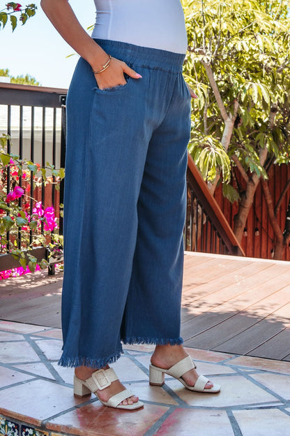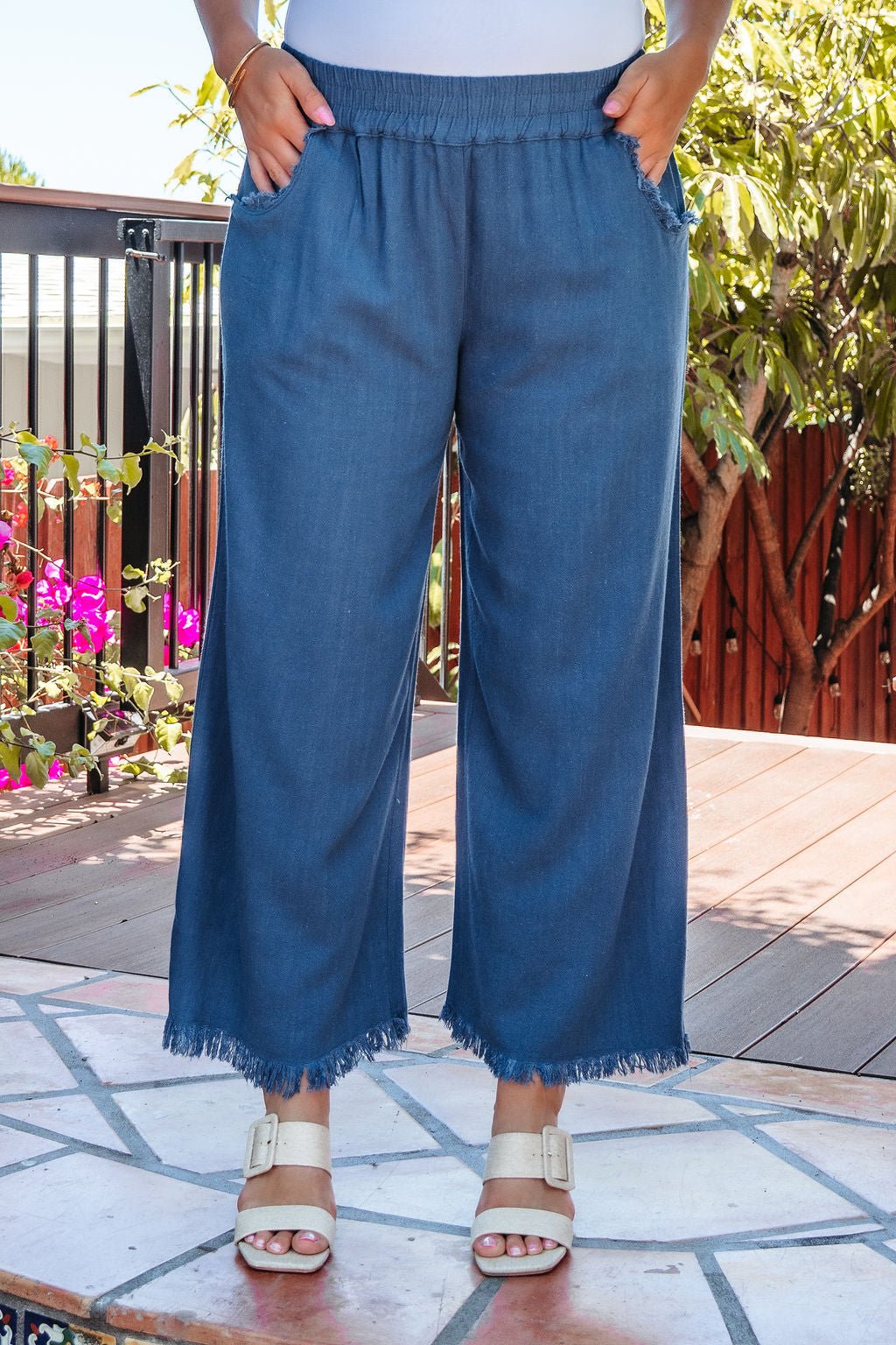 Breezy and effortless, the Slate Blue Frayed Linen Wide Leg Pants are made for warm days and relaxed style. Designed with a wide leg silhouette, soft linen-blend fabric, and a stretchy elastic waistband for all-day comfort. Finished with frayed hems and side pockets for that laid-back, lived-in feel.