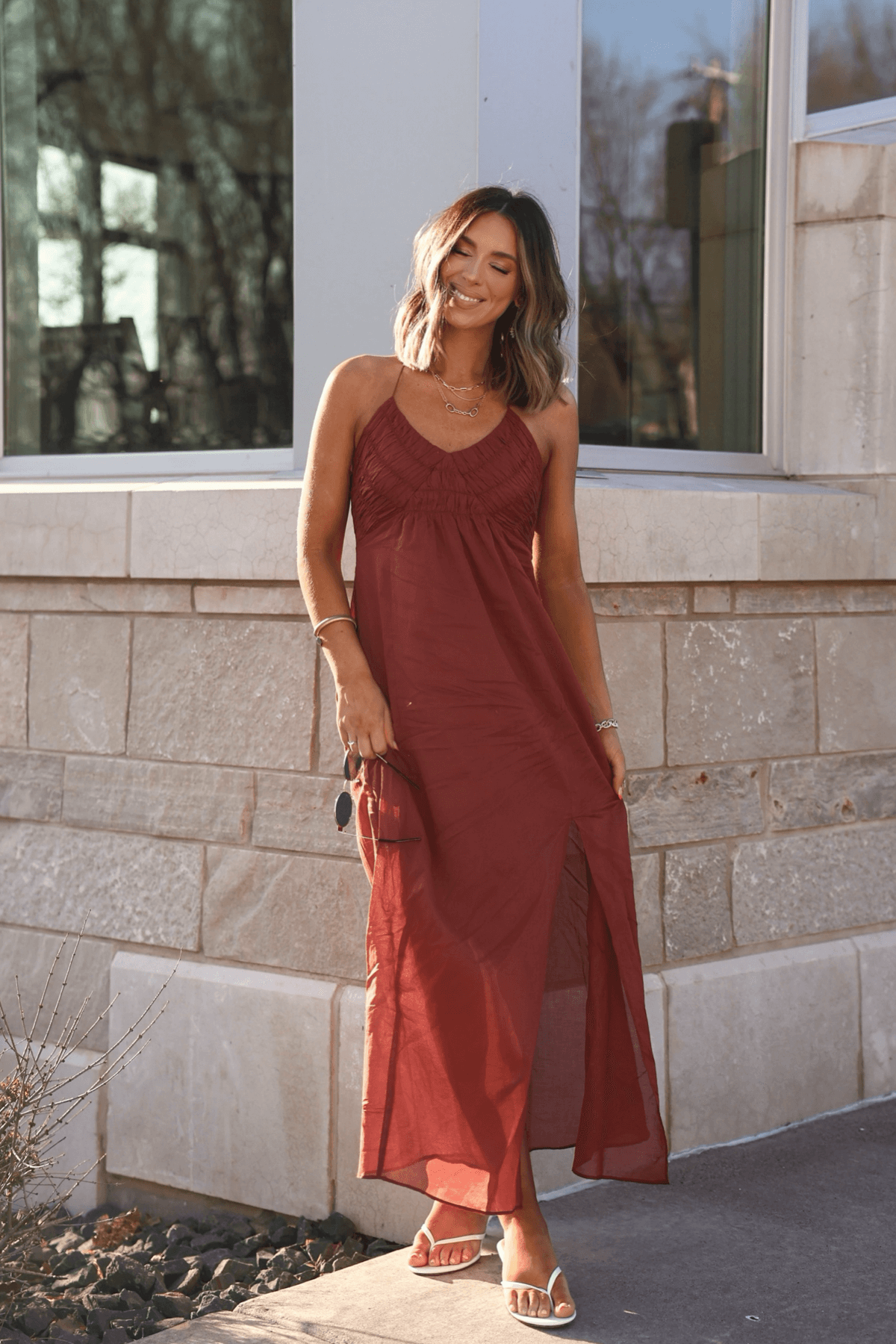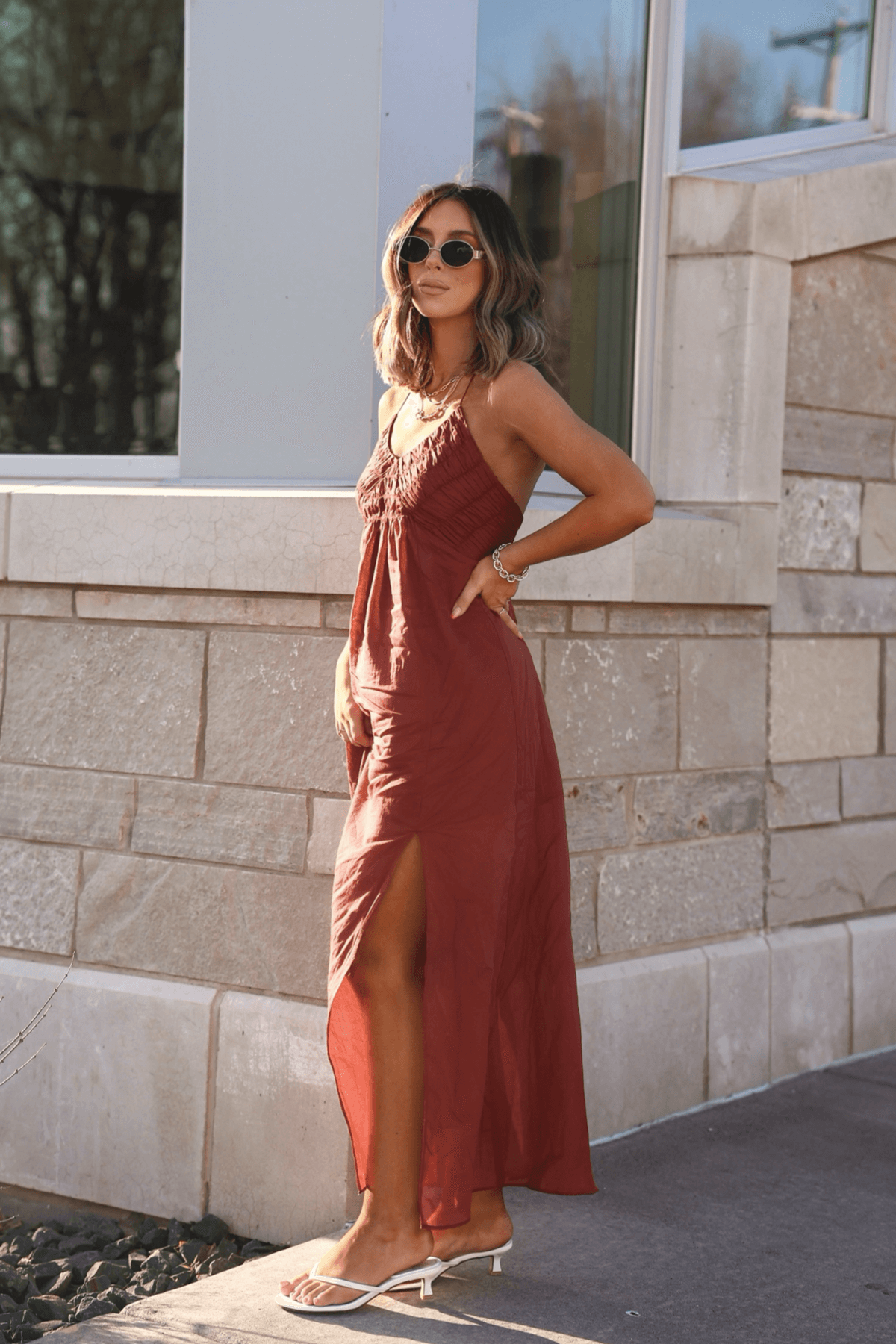 Designed in a dreamy dusty brick hue, this flowy maxi dress features adjustable straps and delicate tie details for a customizable fit. The flattering side slit adds movement and a subtle touch of allure, perfect for breezy days or special nights out. Whether you're heading to brunch, a beachside dinner, or a summer soirée, the Brianna Maxi Dress brings easy sophistication to any occasion.