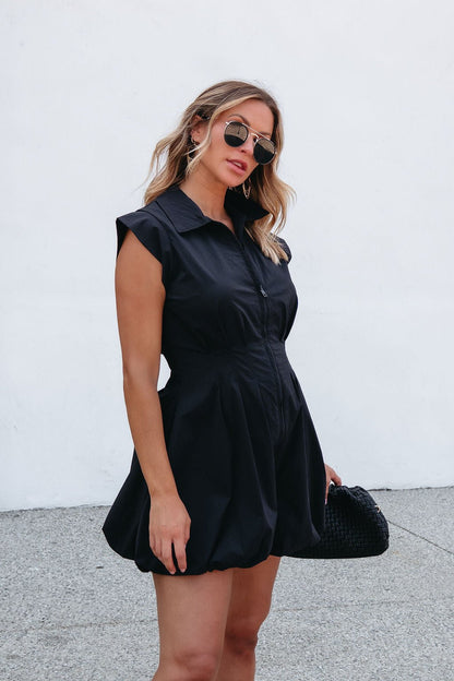 Sporty meets chic in the Steve Madden Dyanne Mini Dress. This standout silhouette features a collared neckline, zip-front detail, and bubble hem for a modern edge. The sleek black fabric has just the right amount of stretch, making it comfortable yet elevated. Whether you dress it up with boots or down with sneakers, this mini is a bold pick for early fall styling.