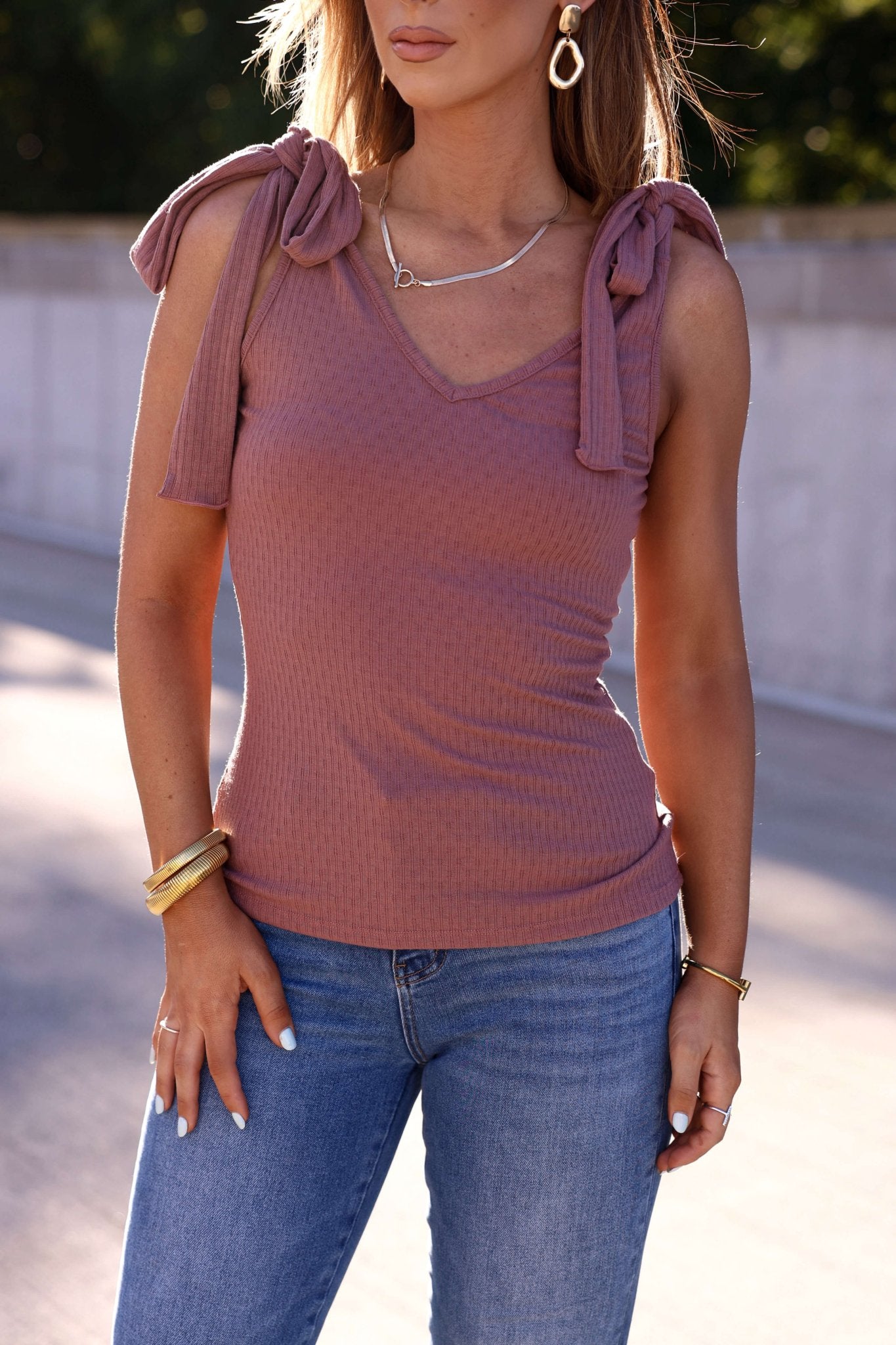 Sutton Ribbed Shoulder Tie Top - Mauve - FINAL SALE